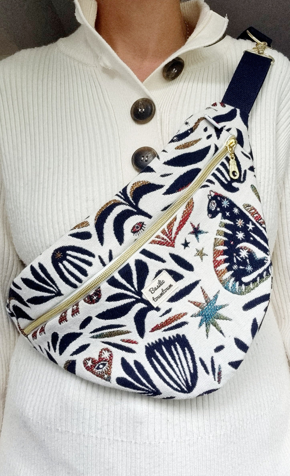 Elle peut être porté en bandoulière, sur la poitrine ou autour de la taille.