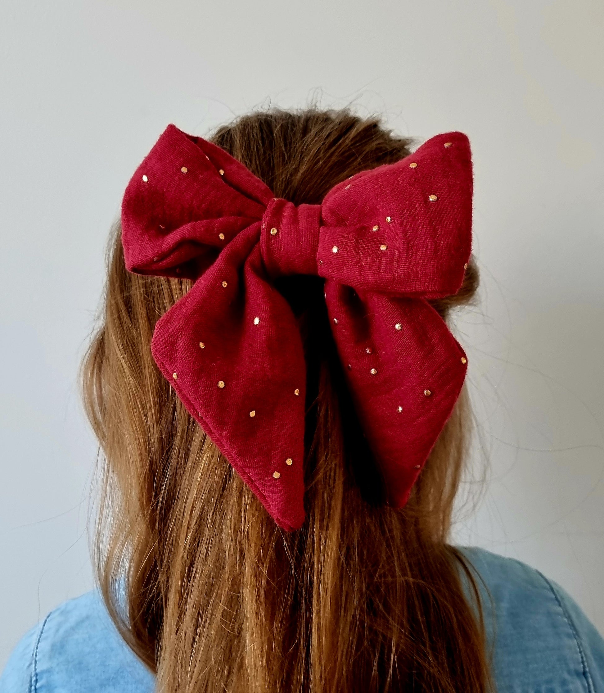 Le noeud gaze de coton bordeaux est confectionné avec une barrette crocodile de 6cm.