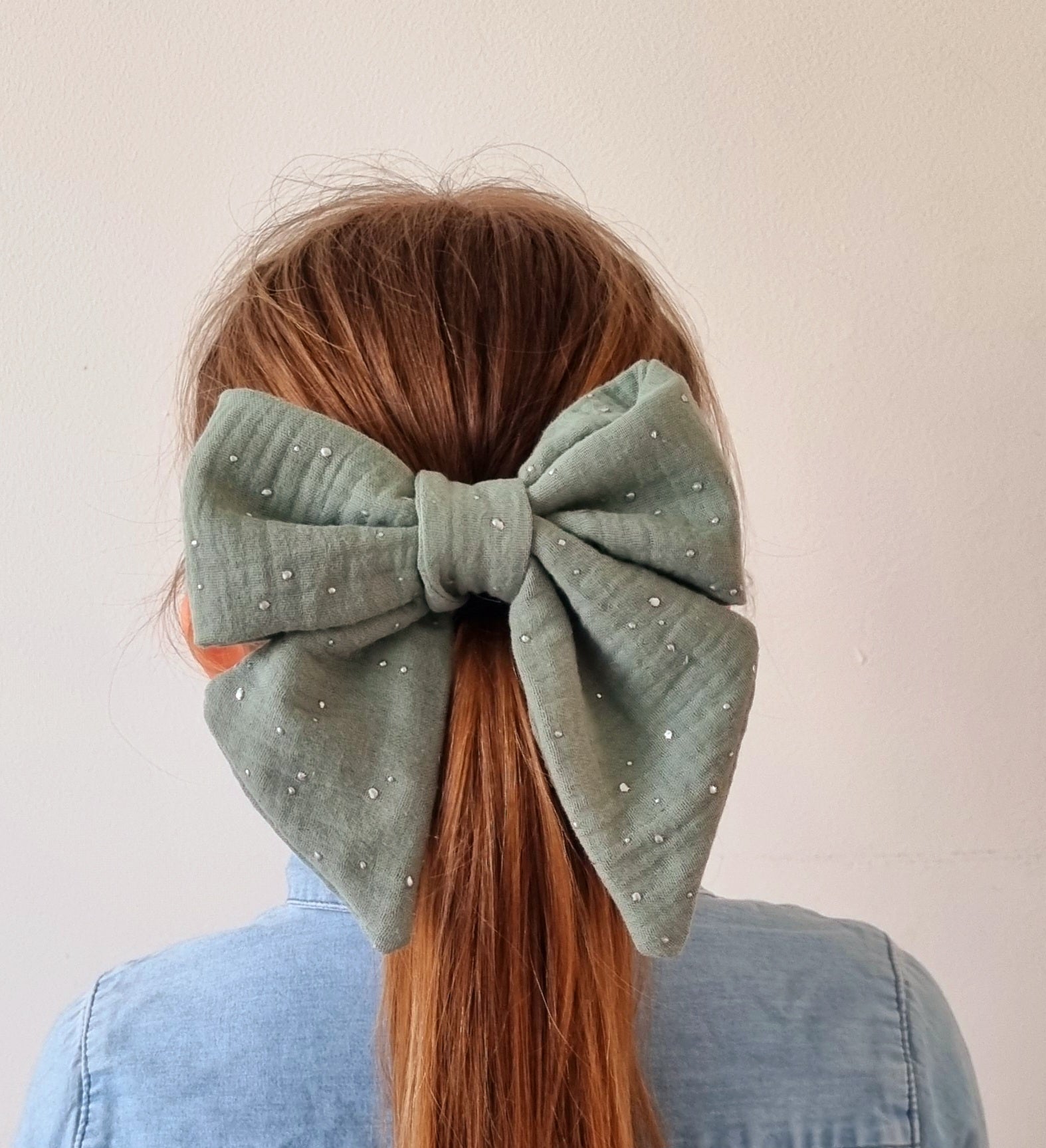 Le noeud gaze de coton vert est confectionné avec une barrette crocodile de 6cm.
